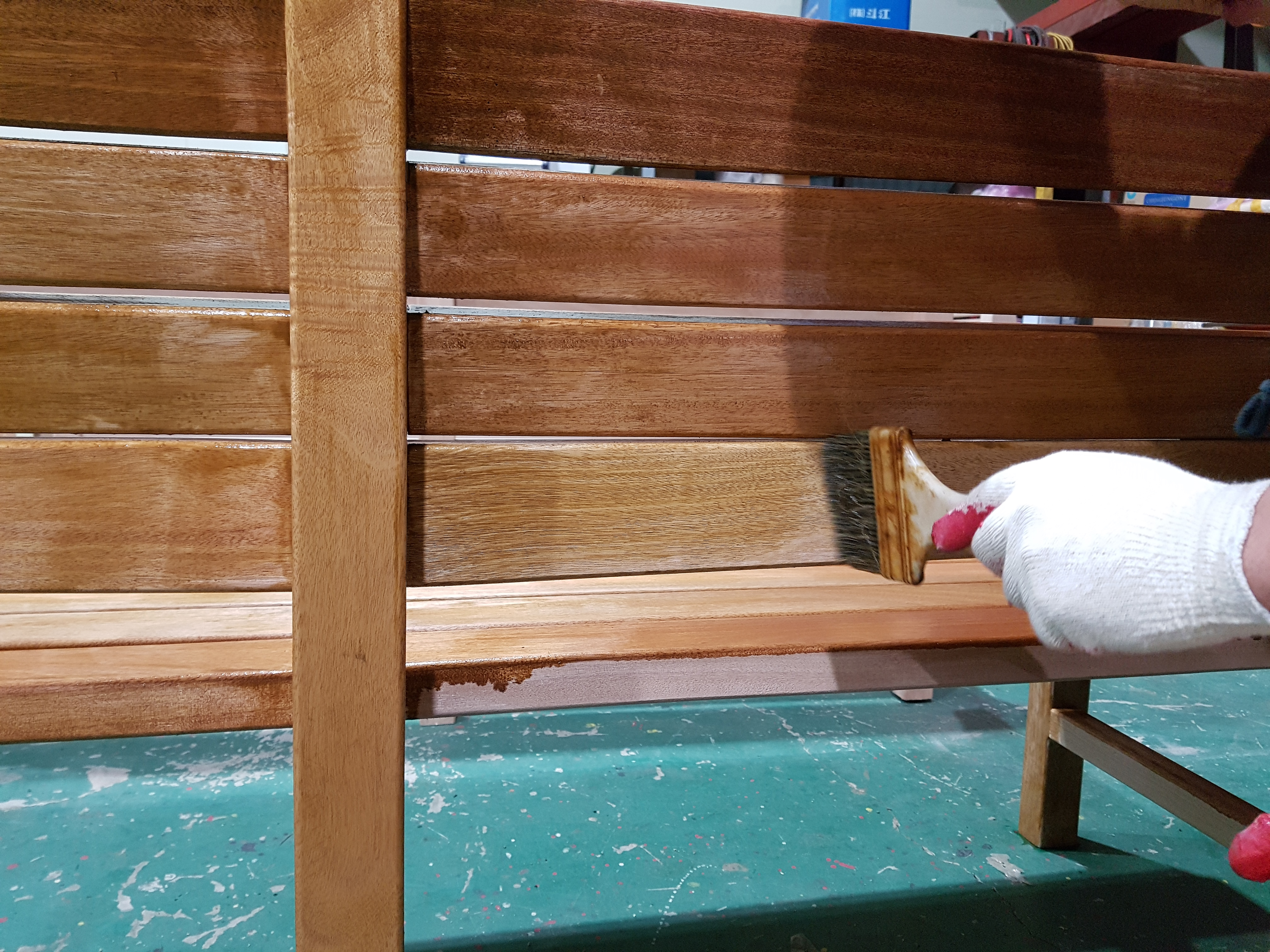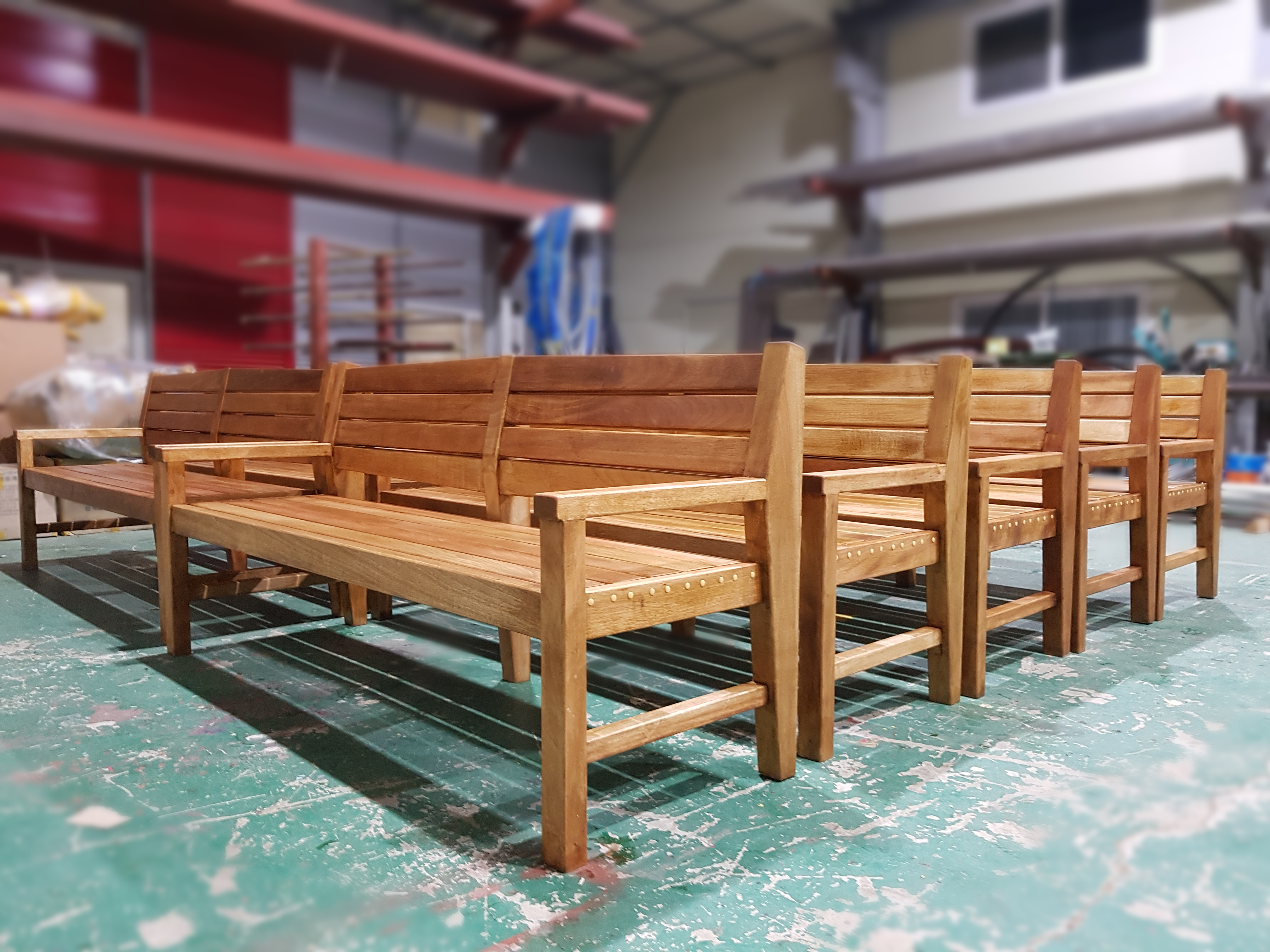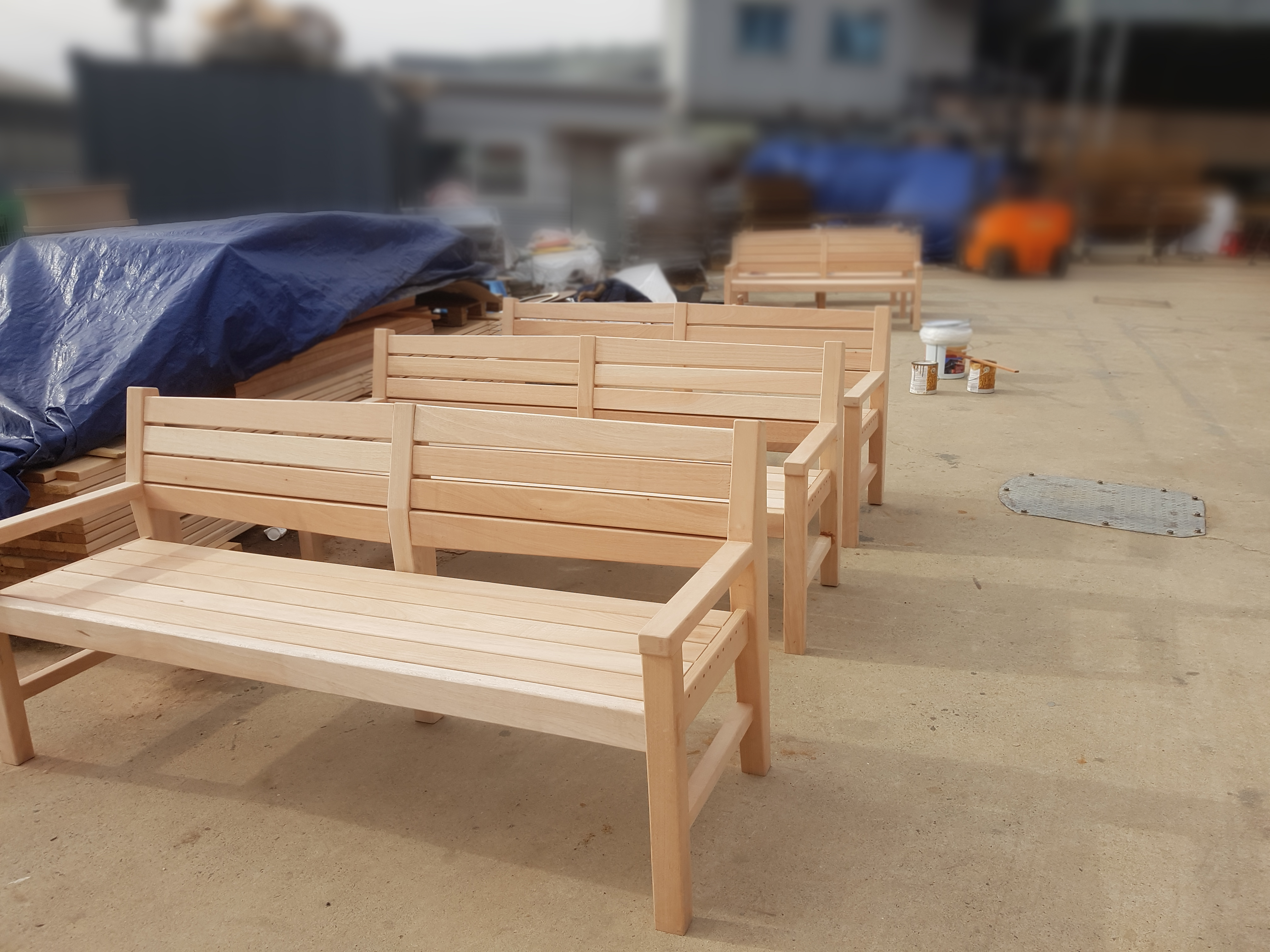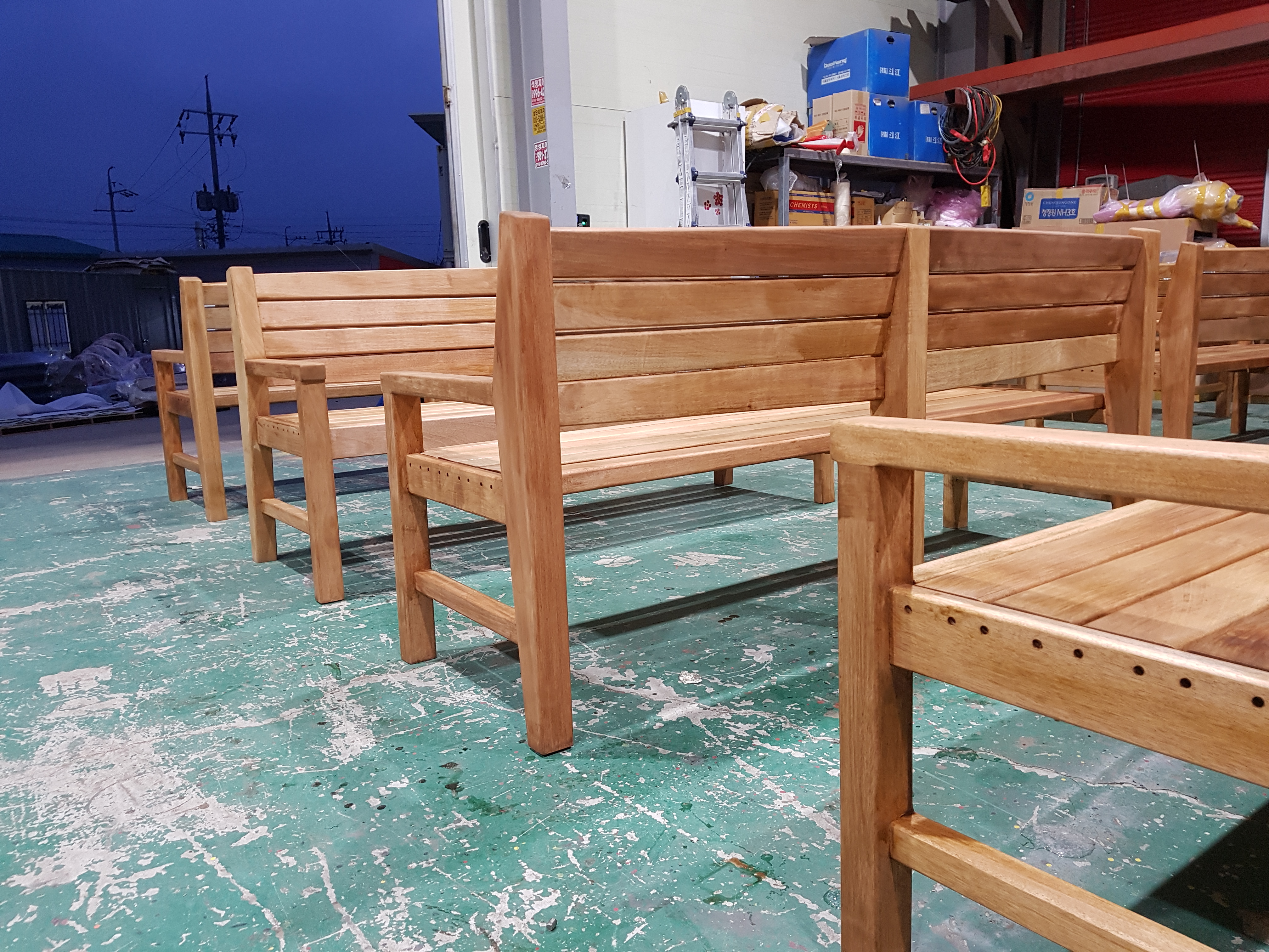 오일스테인 도장이 완료된 원목 벤치들.